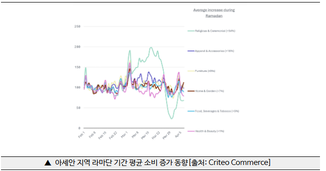 - 글로벌 커머스 데이터(Criteo)에 따르면, 2025년 말레이시아 라마단(`25.3.1~3.30) 기간 소매 판매는 전년 대비 26% 증가했으며, 3월