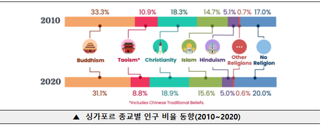 * 싱가포르 통계청에서 10년 주기로 시행하는 2020년도 인구조사에 따르면 인구의 15.6%가 무슬림이며 꾸준히 증가하는 추세