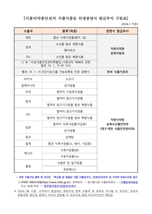 ※ 2026.1월 기준, 식약처가 발급하는 증명서로 향후 수출국 및 품목이 추가될 수 있으며, 상대국 법령개정 등으로 증명서 서식이 변경될 수 있으므로 항상 최신서식인지 확인必