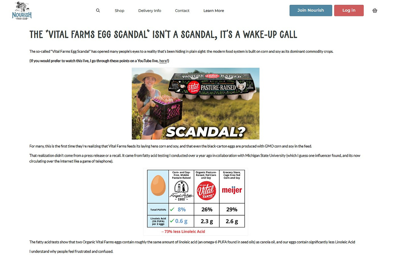 노리시 푸드 클럽은 특정 브랜드를 단순히 비난하려는 것이 아니라고 선을 그었다. 소셜미디어에서 전반적인 내용보다는 특정 수치에 집중돼 자극적으로 번지는 것을 경계하는 입장이다. 그들은 바이탈 팜스가 직접적인 거짓말을 했다기 보다는 방목형이라는 라벨은 USDA(미국 농무부)의 사육 환경 기준을 충족했다는 의미일 뿐, 반드시 이상적인 영양 성분을 보증하는 마크는 아니라는 설명이다.