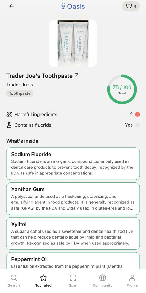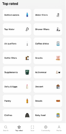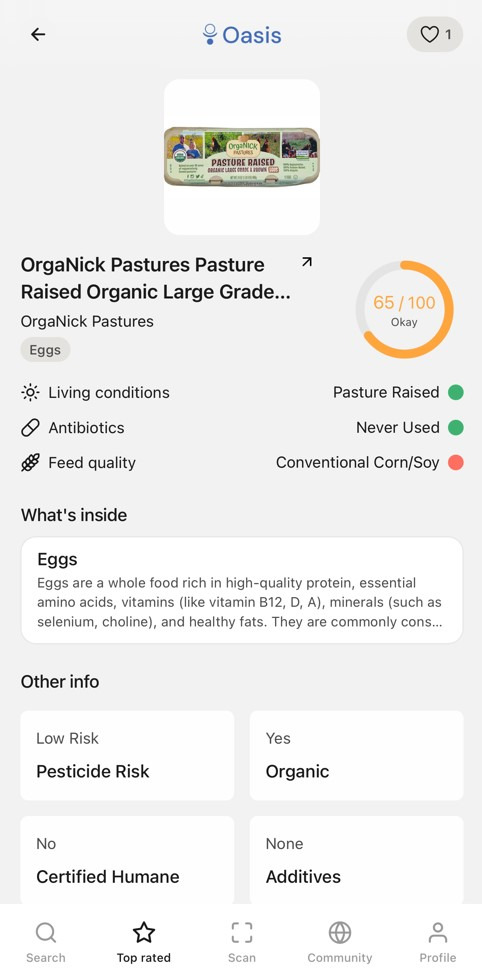 오아시스는 식품뿐만 아니라 일상 용품인 치약, 운동복, 워터 필터, 건강 보조제 등 다양한 품목들을 다루고 있다. 그로서리에서 오아시스 앱으로 제품 사진을 찍으면 바로 해당 제품의 점수를 보여주는 기능을 가지고 있어 구매 시점의 의사결정에 강력한 영향을 미치기도 한다.