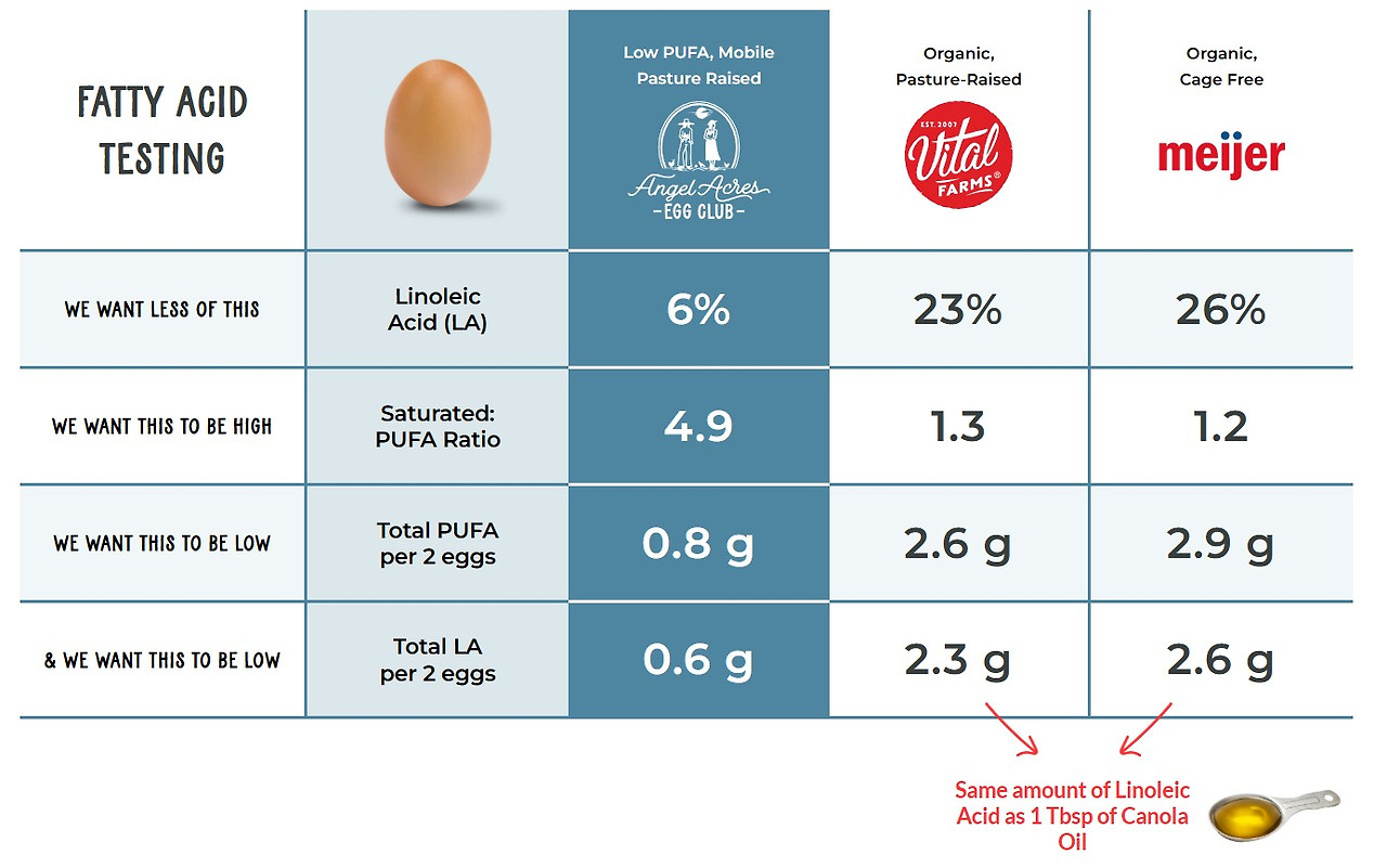그러나 소비자들은 단순 사육 환경을 넘어, 실질적인 데이터로 바이탈 팜스의 입장을 지적했다. 대표적인 지표는 바로 달걀의 지방산 구성이다. 바이탈 팜스의 달걀 리놀레산 비중이 23%로 나타났는데 이는 가공식품과 외식 업계에서 저렴한 가격에 대량 사용되는 대표적인 정제유 중 하나인 카놀라유의 리놀레산 비율(19%)보다도 높은 수치라는 점을 주장했다.