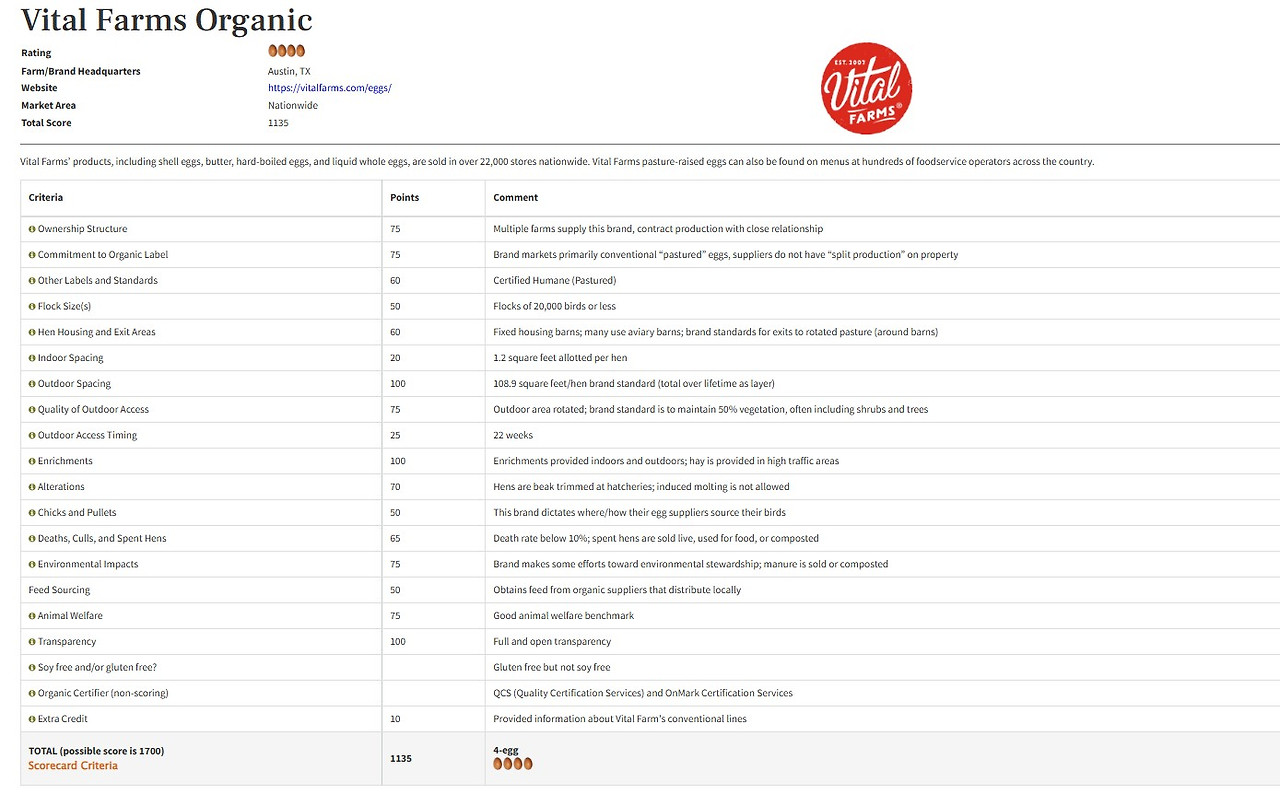 달걀 농장의 경우, 닭이 단순히 밖으로 나갈 수 있는 통로만 있는 것이 아니라 실제로 외부 환경을 얼마나 이용할 수 있는지에 대한 실외 접근성 및 환경, 실내외에서 닭 한 마리 당 충분한 면적이 확보되어 날개를 펼치거나 자연스러운 행동을 할 수 있는지 측정하는 사육 밀도, 병아리를 산란계로 성장하기까지 전 과정을 농장에서 관리하는지, 대두나 옥수수 사료 의존도, 닭의 자연 폐사 및 노계 처리 방식 등 다양한 항목들을 갖추어 점수화하고 있다.