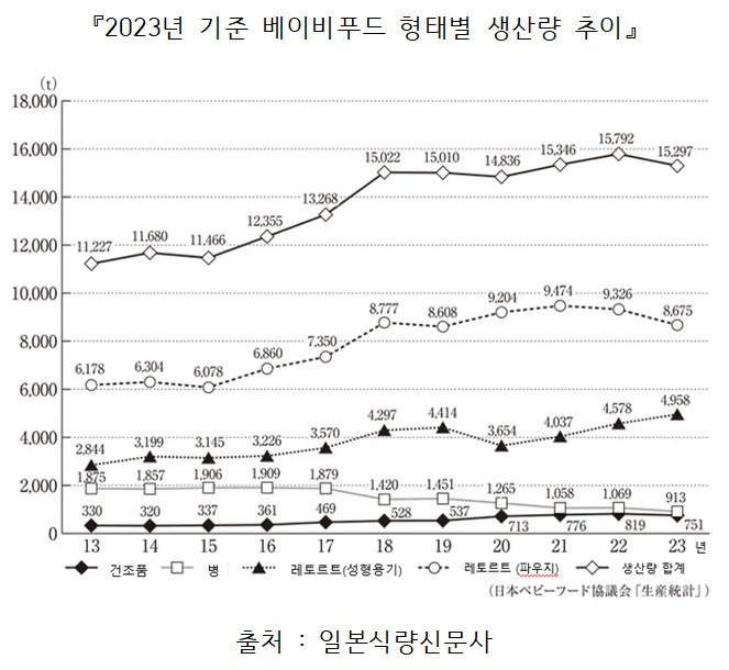 2023년 기준 형태별 생산량 추이를 보면 레토르트 형태의 베이비푸드 비중이 확대되고 있다. 또한 2024년 최신 품목별 통계에서는 주식용 드라이 타입 제품이 전년 대비 성장한 것으로 나타났다. 이는 보관 편의성과 조리 간편성이 소비 선택에 중요한 요소로 작용하고 있음을 보여준다.