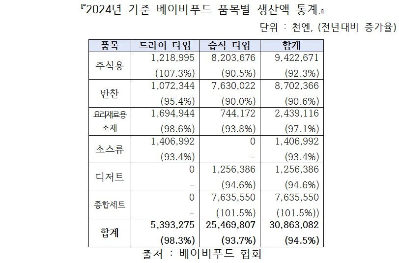 2024년 해당 시장 매출은 전년 대비 5.5% 감소한 약 308억 6,000만 엔으로, 5년 만에 역성장을 기록했다. 물량 기준으로도 전년 대비 약 7.8% 감소해 2023년(3.1% 감소)보다 하락 폭이 확대됐으며, 수치상으로도 시장 축소 추세가 분명히 나타나고 있다. 또한 일본 식품기업 ‘큐피’는 2026년 8월 말 베이비푸드·유아식 사업에서 철수하겠다고 발표했다.