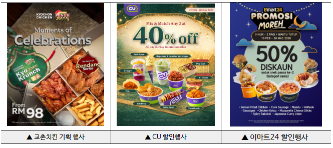 - 편의점 CU는 시간대와 관계없이 인기 제품 2개 구매 시 40% 할인을 상시 제공하여 라마단 기간 내 편의점 식사 수요를 집중 공략