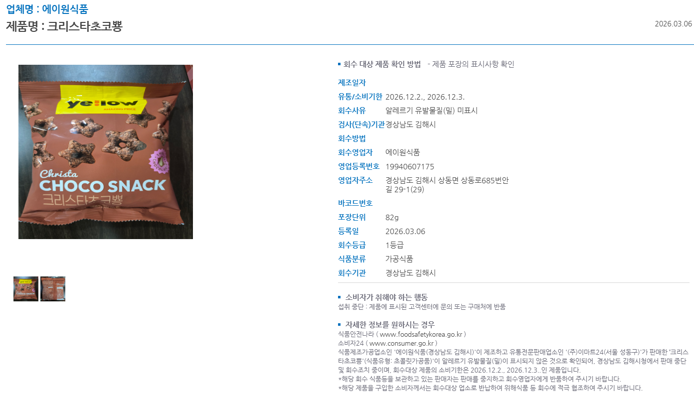 [푸드투데이 = 황인선기자] 식품의약품안전처(처장 오유경)는 식품제조․가공업체인 ‘에이원식품(경상남도 김해시 소재)’가 제조하고 유통전문판매업체인 ‘이마트24(서울 성동구 소재)’가 판매한 ‘크리스타초코뿅(식품유형: 초콜릿가공품)’에 알레르기 유발물질이 표시되지 않은 것이 확인돼 해당 제품을 판매 중단하고 회수 조치한다고 6일 밝혔다.