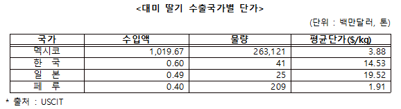 수입단가를 비교하면 아시아산 딸기의 프리미엄 포지션은 더욱 분명하게 나타난다. 2025년 기준 평균 수입단가는 일본산 약 19.52달러/kg, 한국산 약 14.53달러/kg으로 멕시코산 대비 3~5배 수준의 가격대를 형성하고 있다. 따라서 아시아산 딸기의 미국 내 바이럴 현상은 대량판매 시장 진입보다는 고단가 프리미엄 시장에서의 이미지 형성, 미디어 노출 확대, 차별화된 포지셔닝 강화에 더 큰 의미가 있는 것으로 해석할 수 있다.