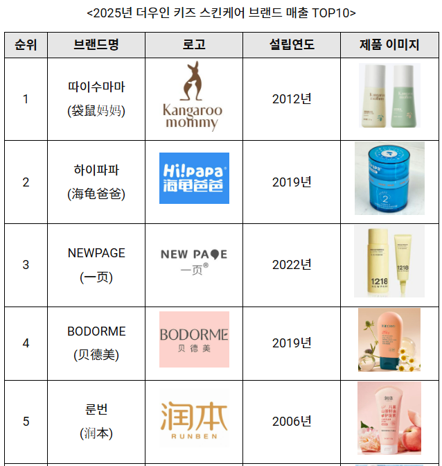 시장조사전문기관 Euromonitor International에 따르면 중국 키즈 케어 제품 시장은 향후에도 지속적인 성장세를 이어갈 것으로 전망되며 특히 키즈 스킨케어 제품이 시장 확대를 이끄는 핵심 분야로 평가된다. 다만 중국 내 상위 브랜드들의 매출 규모는 대체로 10억~20억 위안 수준에 머물러 있으며 다수 브랜드가 5억~10억 위안 또는 그 이하 규모에 분포하고 있다. 이는 현재 해당 시장이 아직 절대적 시장 지배력을 가진 단일 브랜드가 형성되지 않은 분산형 시장 구조임을 의미한다.