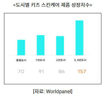 중국 내 키즈 세정·케어 시장의 또 다른 특징은 3·4선 도시를 중심으로 한 ‘하침시장(下沉市场)’의 빠른 성장이다. 글로벌 시장 조사 업체 Worldpanel에 따르면 키즈 스킨케어 제품의 가구당 소비 지출 증가율이 3·4선 도시에서 157의 성장지수를 기록하며 1선 도시를 크게 상회한 것으로 나타났다. 구체적으로 보면 3·4선 도시의 성장 속도는 1선 도시보다 약 66%, 2선 도시보다 약 71%, 중점도시보다 약 87% 높은 수준으로 나타나 하침시장에서 소비 확대가 상대적으로 빠르게 진행되고 있음을 시사한다.