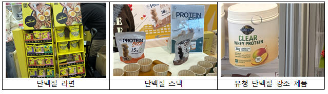 ◦ 올해 박람회에서는 젤리, 커피, 탄산음료, 프레첼, 아이스크림, 초콜릿은 물론 라면에 이르기까지 거의 모든 카테고리에서 단백질 강화 제품이 쏟아졌다. 전시장 곳곳에서 관련 제품이 반복적으로 노출될 만큼 단백질 트렌드의 확산세가 두드러졌으며, 이제 단백질은 일부 스포츠 영양식에 국한된 개념이 아니라 식품 전반에 적용되는 핵심 요소로 자리잡는 분위기다.