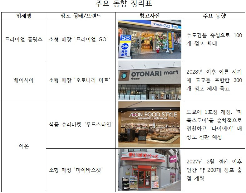 또한 '세이유(Seiyu)'를 인수하며 수도권에 진출한 '트라이얼(Trial)' 역시 세이유 매장 주변에 소형 점포 '트라이얼 GO'를 출점하는 전략을 추진하고 있으며, 수도권을 중심으로 100개 점포 확대를 목표로 하고 있다.