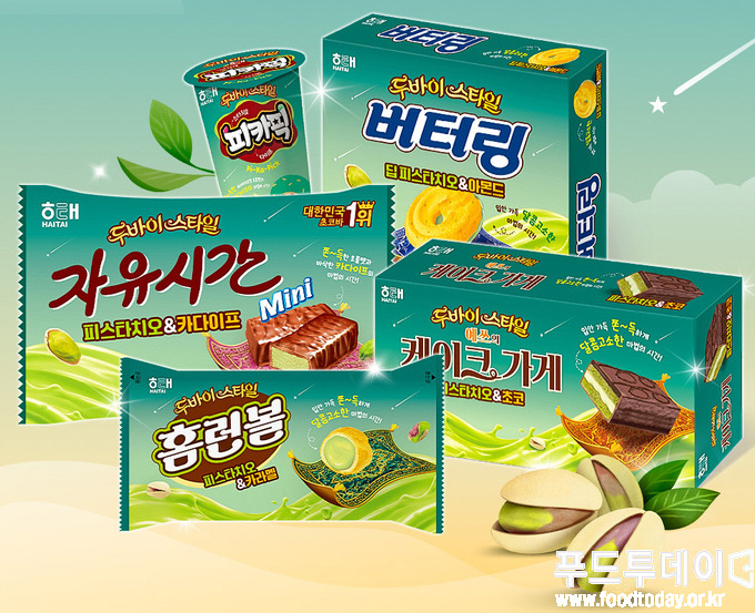 해태는 두바이 디저트를 과자로 즐기는 두바이 스타일 시리즈를 선보인다. 피스타치오의 고소한 매력을 다양한 과자로 맛볼 수 있는 팔방미인 컬렉션은 △홈런볼 △예쓰의케이크가게 △버터링 △자유시간 △초코픽 등 5종이 그 주인공. 해태를 대표하는 브랜드 중 두바이 디저트의 맛을 잘 녹여낼 수 있는 제품들로 구성했다.