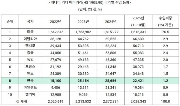베이커리 제품을 포함하는 HS Code 1905.90 기준 한국산 수입액은 2022년 1510만 캐나다 달러에서 2024년 2866만 캐나다 달러로 약 90% 증가했다. 시장 점유율도 0.75%에서 1.21%로 확대되며 한국은 수입국 8위에 진입했다.