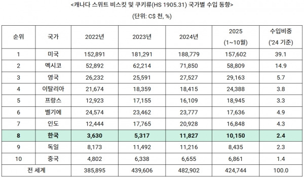 캐나다 시장에서 한국식 디저트의 성장 가능성은 수입 통계에서도 확인된다.