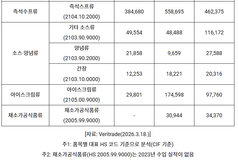 베리트레이드(Veritrade) 수출입 통계를 기준으로 2023~2025년 페루의 주요 K-푸드 수입액 추이를 분석한 결과, K-푸드 수입 시장은 규모가 크지 않으나 품목 전반으로 확대되고 있는 것으로 확인된다.