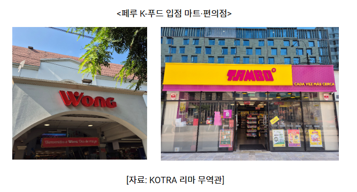 이에 더해, Wong, PlazaVea, Metro 등 대형마트와 Tambo 등 편의점 체인이 수입식품 코너에 K-푸드를 입점시키면서 대중 소비자와의 접점이 크게 확대되었다. 대형마트는 국제식품 섹션을 통해 수입 제품을 일상적 쇼핑 동선에 자연스럽게 노출시키고, 편의점은 한국 수입식품 전용 코너를 운영하여 주거지 인근에서의 접근성을 높이고 있다. 전문매장과 달리 별도의 탐색 없이도 K-푸드를 접할 수 있어, 비(非)팬덤 소비자의 자연스러운 유입에 기여하고 있다.
