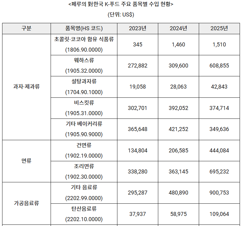 페루 K-푸드 수입 현황: 주요 품목 중심으로 성장세 확대