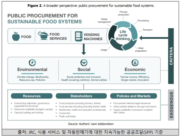 엘리오(Elior)의 2024/25 회계보고서 ESG 지표에 따르면, 전체 조달 물량의 66.2%를 현지 지역 농산물로 충당하고, 인증 식품 구매 비중 15.3%를 달성했다. 소덱소(Sodexo) 역시 공공조달 정책 아래 2025년까지 수산물의 100%를 지속가능한 어업 및 양식 방식으로 조달하고, 2030년까지 팜유, 대두 등 주요 원재료 공급망에서 산림 파괴와 연계된 요소를 제거하는 것을 목표로 하고 있다. 더불어 EU 집행위원회 산하 공동연구센터(JRC) 또한 학교·병원·공공기관 급식 조달 시 환경·사회·경제 요소를 함께 고려하는 지속가능 공공조달 기준을 제시하고 있어, 향후 유럽 시장에서는 ESG 및 공공조달 대응 역량이 핵심 경쟁 요소로 작용할 가능성이 높다.