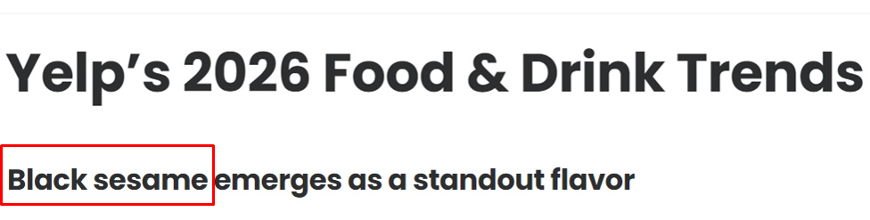 미국의 음식점 리뷰 플랫폼 옐프(Yelp)도 ‘2026 식음료 트렌드 보고서’에서 올해의 주요 트렌드로 ‘아시아 식재료의 부상’과 함께 흑임자를 꼽았다. 보고서에 따르면 말차 라테에 흑임자 크림을 얹은 ‘흑임자 말차 라테’ 소비는 작년 9월 기준으로 1년 사이 147% 폭증했다. ‘흑임자 라테’는 23%, ‘흑임자 디저트(흑임자 케이크, 흑임자 크루아상 등)’는 21% 늘었다.