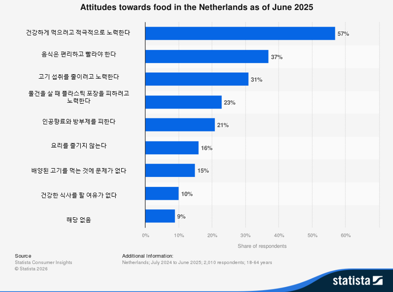 스태티스타(Statista)가 2024~2025년 실시한 조사에 따르면, 네덜란드 소비자의 식품에 대한 태도는 ‘건강 중심’으로 뚜렷하게 나타난다. 특히 2025년 온라인 설문조사에서는 응답자의 57%가 “건강한 식단을 유지하기 위해 적극적으로 노력한다”고 답해, 건강 지향적 소비가 이미 일상적인 기준으로 자리 잡았음을 보여준다.
