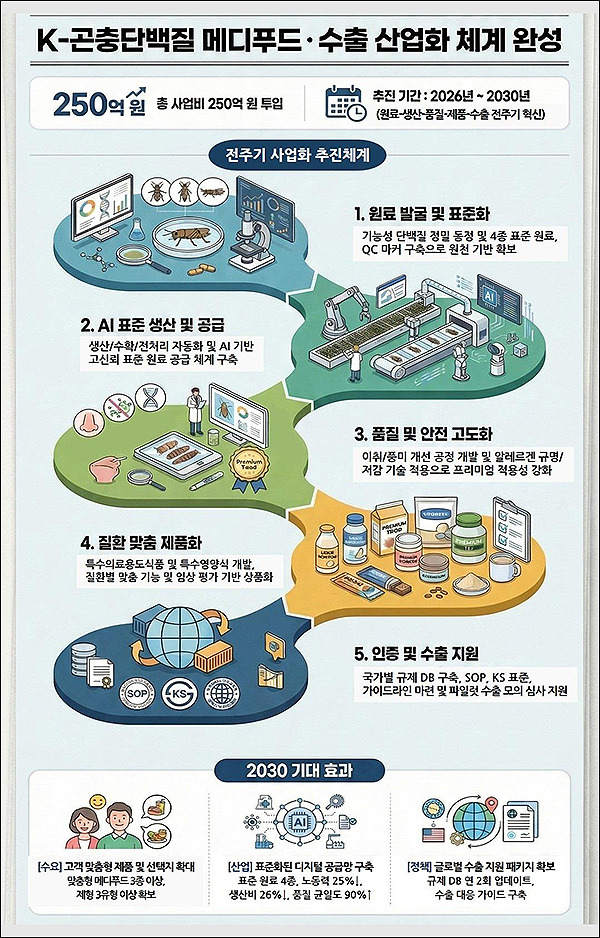 농진청은 올해부터 2030년까지 산·학·연·관과 협력해 산업 현장의 병목현상을 해소하고, 케이-곤충단백질의 특수의료용도식품(메디 푸드) 소재화와 수출 산업화 체계를 구축한다는 계획이다.