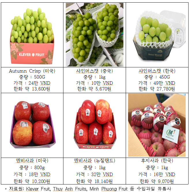 - 베트남 소비자들의 수입 과일에 대한 인식 개선 및 가처분 소득 증가에 따라 베트남의 수입 과일 시장은 지속적으로 확대될 것으로 판단되며, 이에 따른 프리미엄 과일 수출이 유망할 것으로 판단됨