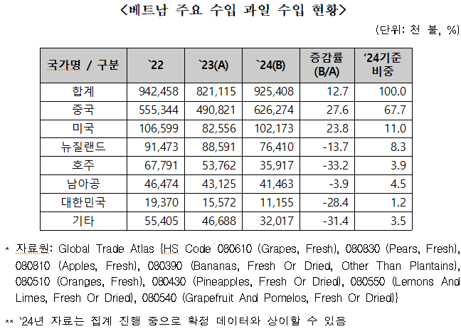 - 베트남 세관의 자료에 따르면 `24년 베트남의 신선품목 수입액은 *240억 달러를 기록, 전년도 동기 대비 24% 증가하였으며, 주요 수입국은 중국과 미국으로 확인되며 양 국가에서 수입액의 합계는 **150억 달러로 중국 10억 달러, 미국 5억4천4백만 달러로 전체의 약 62.5%를 차지하였음