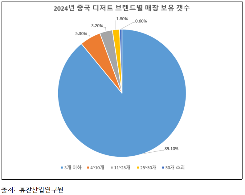 홍찬산업연구원의 빅데이터에 따르면, 2024년 중국 내 디저트 매장은 16만 개를 넘어섰다. 그러나 콜드체인의 난이도, 신선도 유지 한계 등 특성으로 인해 규모화는 비교적 낮은 수준이다. 2024년 기준 약 90%의 디저트 브랜드가 3개 이하 매장을 운영 중이며, 25개 이상 매장을 가진 브랜드 비율은 2.4%에 불과하다.