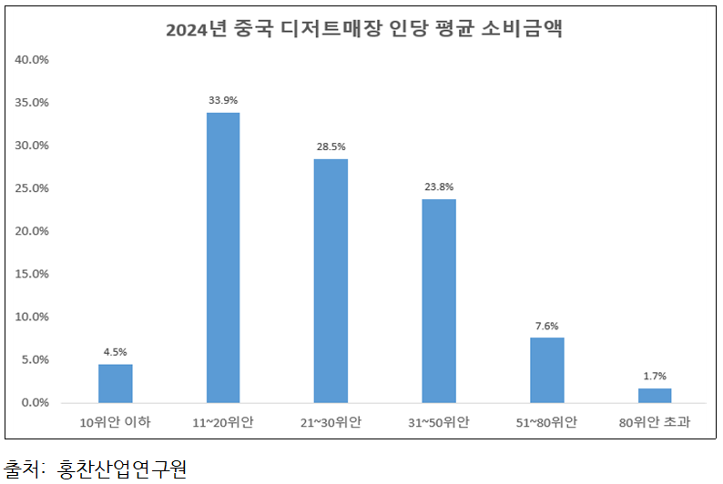 소비자의 인당 평균 소비금액을 살펴보면 디저트 매장을 방문하는 소비자 중 11~20위안(한화 약 2,200~4,000원)을 소비하는 소비자가 33.9%로 가장 비율이 높았으며, 21~30위안(약 4,200~6,000원), 31~50위안(약 6,200~10,000원)이 뒤따랐다.
