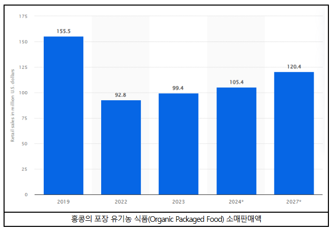 홍콩 신선 야채(Fresh Vegetables)에 대한 수요는 신선함과 품질을 중요시하는 홍콩 소비자들의 기호와 더불어 건강을 우선시하면서도 고품질을 추구하는 젊은 소비층 증가와 맞물려 더욱 늘어날 것으로 예상되며 특히, 유기농 신선 야채 시장이 더욱 각광받을 것으로 전망되는데 홍콩의 유기농 신선 야채 제품을 포함한 유기농 식품의 경우 2024년 8월 조사기관 Euromonitor에서 발표한 조사에 따르면 2023년부터 2027년까지 평균 4.9%의 성장률로 2027년에는 포장 유기농 식품(Organic Packaged Food***)의 소매판매액이 약 USD 1.2억 불에 달할 것으로 전망된다.
