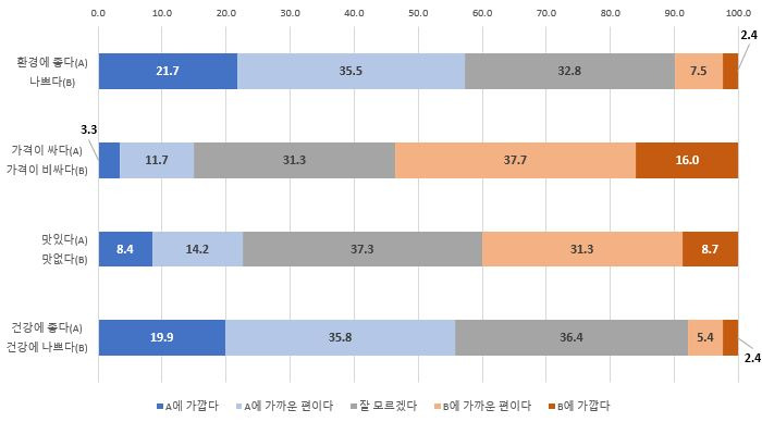 이러한 일본 대체식품 시장에 한국기업이 진출하기 위해서는 어떤 준비가 필요할까? 위 닛폰햄사의 설문조사 내용을 정리해 보면, 일본 소비자는 식물 기반 대체식품에 대해 ‘환경과 건강에 좋을 것 같지만 맛이 없고 가격이 비싸다’라는 인식이 큰 것을 알 수 있다.