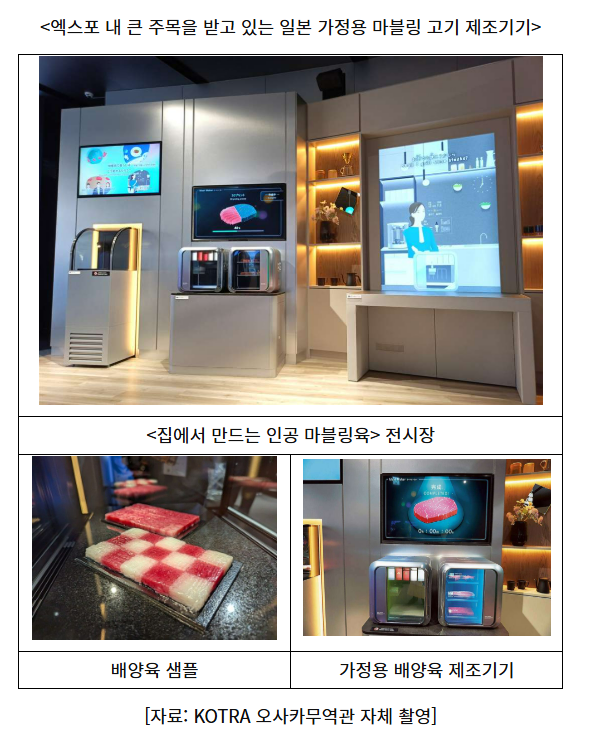 전시 관계자는 KOTRA 오사카무역관과의 인터뷰에서 “일본은 고령화와 농축산업 인력 부족, 기후 변화에 대응할 지속 가능한 축산 대안 마련이 중요한 과제로 남아 있다”라며, “이번 전시를 통해 이러한 문제에 대한 해답으로 배양육 기술을 제시했다”라고 설명했다. 이어 그는 “밥을 취사기로 짓는 것처럼, 머지않은 미래에는 가정에서도 직접 고기를 만드는 모습을 볼 수 있을 것”이라고 전망했다.