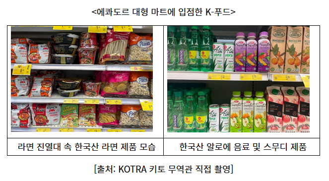 한국의 대 에콰도르 총 소비재 수출액은 2022년 5백만 달러에서 2024년 2234만 달러로 감소했으나, 김이나 음료 및 주류 제품의 수출 증가가 눈에 띈다. K-푸드는 현지 주요 한인마트나 아시안 마트, Supermaxi와 같은 대형 슈퍼마켓 체인이 에콰도르로 직수입한다. 다른 수입경로로는 주변국인 페루나 콜롬비아로 우회해 육로를 통해 수입되고 있어, 관세청 자료 내 한국의 대 에콰도르 식음료 수출 통계에는 반영이 안된 것으로 파악된다.