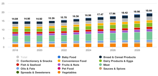 에콰도르의 식품에 대한 소비자 지출은 2025년 기준 전년대비 3% 증가한 약 175억 달러로 예상되며, 연평균 약 3%씩 성장하여 2029년에는 197억 달러에 달할 것으로 전망된다. 향후 5년간(2025~2029년) 에콰도르 식품 시장이 지속적으로 성장할 것으로 보고 있으며 빵·쌀·곡물류, 파스타(면류 포함), 제과류, 유제품, 고기 등 전반적인 증가가 예상된다.