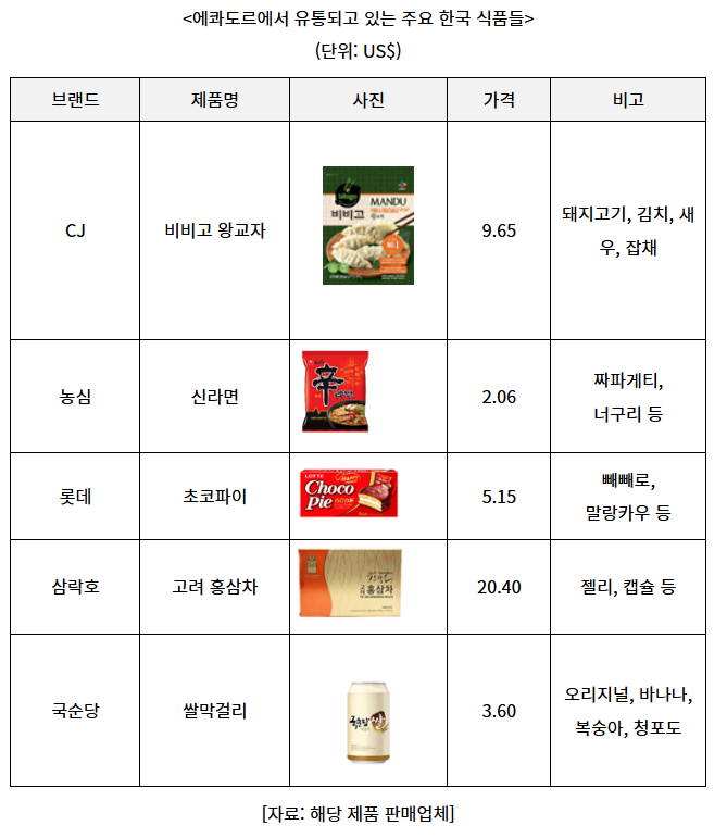자료: 재외동포청, Global Trade Atlas, 한국 관세청, 세계농업 2020.3월호 에콰도르 식품산업현황, INEC, Kantar, 에콰도르 현지 언론(Primicias, El Universo, El Diario, El Comercio), Casa Korea 인터뷰 자료, KOTRA 키토 무역관 자료 종합
