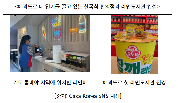 에콰도르 내 한국 식품 주요 수입 및 판매업체 중 하나인 까사 꼬레아(Casa Korea)는 조리가 번거로운 봉지 라면보다는 간단하게 먹을 수 있는 컵라면의 현지 수요가 더 많은 점을 반영하여 한국 편의점처럼 매장을 꾸몄다. 매장 내 컵라면 조리기, 에어프라이기 등을 두어 간편하게 라면이나 핫도그 등 가공식품을 조리해 먹을 수 있도록 배치했다. 2024년 12월에는 한국의 라면 도서관과 같은 '라면 도서관(Libreria de Ramen)'을 에콰도르에 처음으로 오픈하기도 했다. 또한, 한국식 핫도그 제품은 에콰도르에서는 일반적으로 '콘도그(Corn Dog)'라고 불리며 현지인들 사이 인기가 높다. 소주나 막걸리의 경우 과실 혼합주 등 알코올 맛이 강한 제품보다는 달콤한 주류의 선호도가 높다.