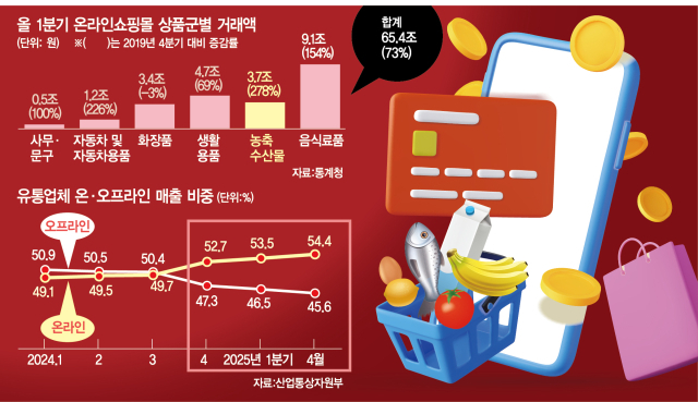 이 같은 흐름은 주요 유통업태 매출 추이에서도 잘 나타난다. 산업통상자원부가 이날 발표한 ‘4월 주요 유통업체 매출 동향’에 따르면 4월 온라인 매출은 전년 동기 대비 15.8% 증가한 반면 오프라인 매출은 같은 기간 1.9% 감소했다. 특히 온라인 매출 중 식품군의 매출 증가율이 21.3%로 서비스 부문(50.1%)과 함께 전체 온라인 매출 증가세를 견인했다. 유통업체 전체 매출 중 온라인이 차지하는 비중 역시 54.4%까지 증가했다. 산업부 관계자는 “오프라인은 명품을 제외한 대부분 품목군의 매출이 감소한 반면 온라인은 음식배달과 e쿠폰, 여행 상품 등 서비스와 식품 중심의 성장세가 지속되고 있다”고 설명했다.