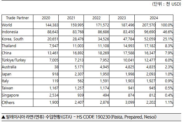 ❍ 말레이시아 라면은 연간 208백만달러 수입(2024년기준), 인도네시아 97백만불, 한국 52백만불, 태국 17백만불 순이며 한국산은