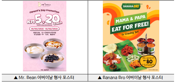 - 인도식 프랜차이즈 Banana Bro는 5~6월 두 달 동안 저녁 6시 이후 80링깃 이상 구매 시 부모님들에게는 단품 메뉴를 무료로 제공하는