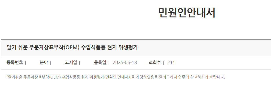 법령, 보도자료, 매뉴얼등 참조사항 알기 쉬운 주문자상표부착(OEM) 수입식품등 현지 위생평가 곡산 2025. 6. 19. 07:19 2506-18 알기쉬운+주문자상표부착(OEM)+수입식품등+현지+위생평가(민원인+안내서)-복사.pdf 9.66MB