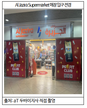 바레인 내 주요 대형 유통매장으로는 Al Jazira Supermarket, Mega Mart, LuLu Hypermarket, Carrefour, Alosra Supermarket 등이 있으며, aT 두바이지사는 ’25년 5월, 바레인 현지 대형 유통매장 및 한국마트를 직접 방문하여 한국 식품 취급 현황에 대한 시장 조사를 실시했다.