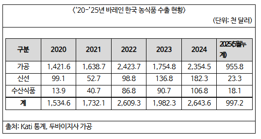 2024년 기준, 바레인으로의 한국 농식품 수출액은 약 264만 3,600달러로, ‘20년 약 153만 4,600달러 대비 연평균 14.56% 증가했다.