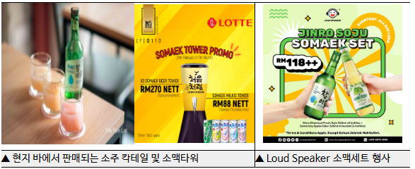 - 현지 인기 노래방 체인 Loud Speaker는 진로 소주 2병, 썸머스비 사과 맥주 4병 세트를 약 RM118 (약 37,760원)에 제공하며 밤 시간대