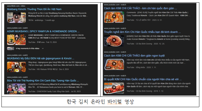 - 유튜브, 틱톡을 포함한 다양한 플랫폼에서 한국 김치에 대한 온라인 마케팅이 이루어지고 있으며, 한국의 인터넷 방송의 형태인 먹방이 베트남 현지에서도 인기를 끌며 MUKBANG으로 표기되며 다양한 한국 음식과 곁들이는 반찬으로 김치는 큰 사랑을 받고 있음
