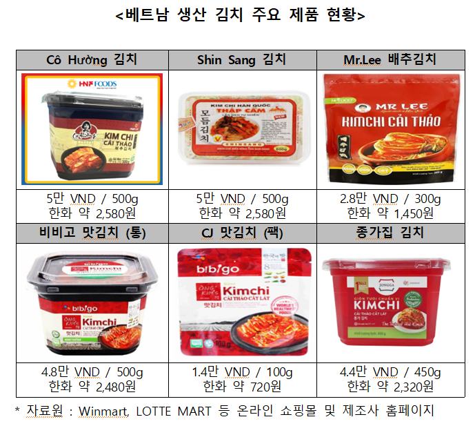 - 김치는 베트남 현지 소비자들에게 익숙한 품목으로, 현지 유통 매장 및 재래시장에서도 김치를 구매할 수 있을 만큼 인지도가 높은 품목임