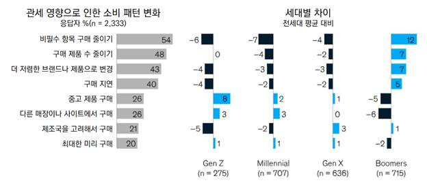 세대별 차이도 뚜렷하게 나타났다. 밀레니얼 세대는 소비 방식을 바꿨다는 응답이 전체 평균보다 6%p, 바꿀 계획이라는 응답도 2%p 높았다. Z세대는 아직 변화 중이거나 준비 중인 응답 비중이 가장 높았으며, 이미 바꿨다고 답한 비율은 전체 평균과 유사했다. 반면 베이비붐 세대는 변화 의지가 상대적으로 낮았다. 소비 패턴을 이미 바꾸었거나 바꿀 예정이라는 응답은 전체 평균보다 각각 4%p, 5%p 낮았으며, 현 수준을 유지하겠다는 응답은 28%로 전체 평균보다 6%p 높았다. 관세 인상과 물가 상승 속에서도 각 세대는 서로 다른 속도와 방식으로 소비를 조절하고 있는 모습이다.