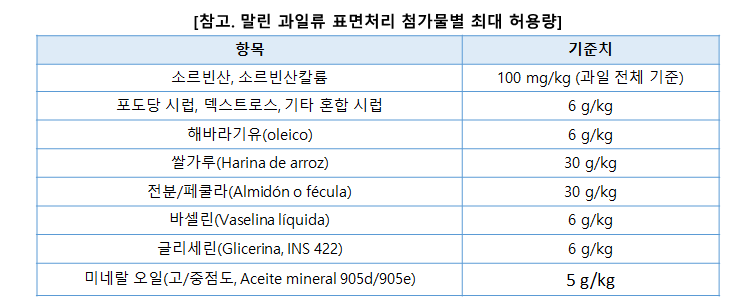 - 대상 식품은 말린 과일류 제품으로, 해당 첨가물은 외피 표면 처리 목적으로만 사용 가능함. 사용 가능 물질의 목록은