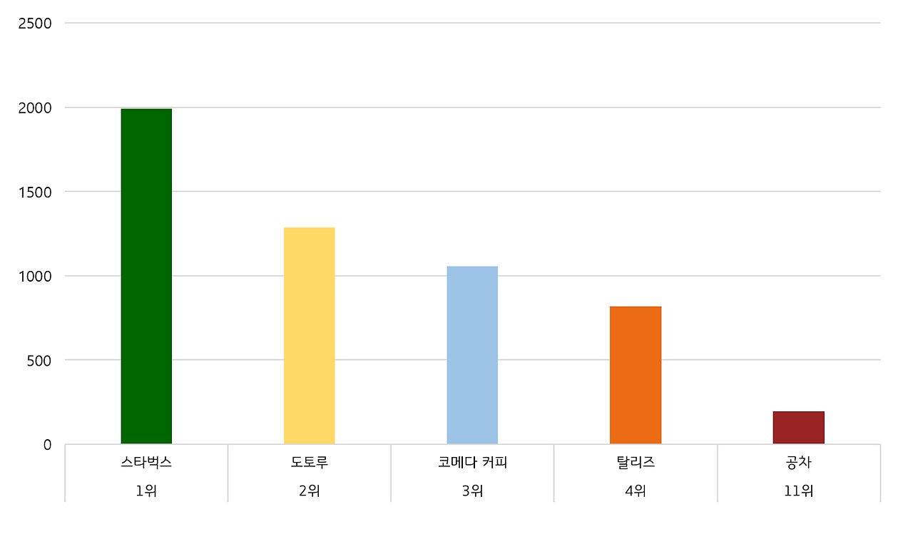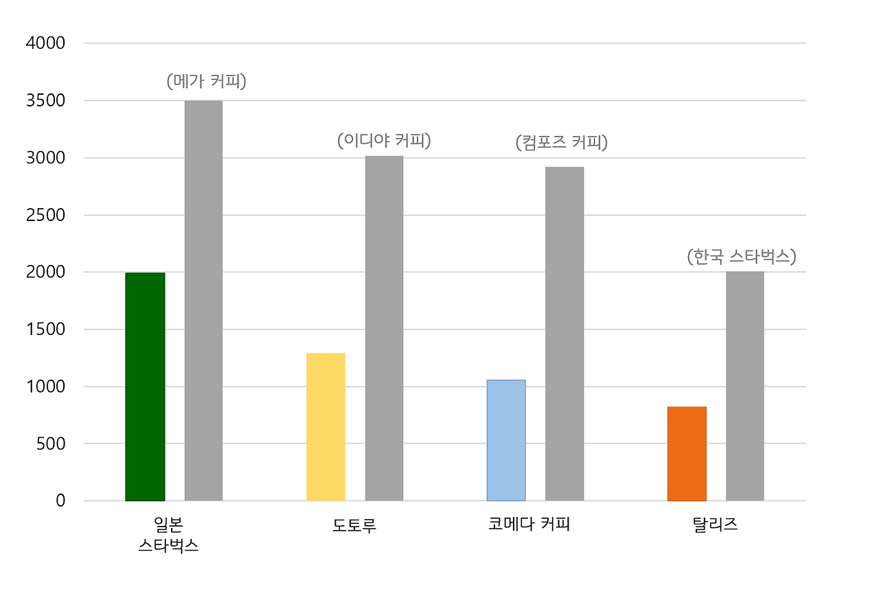 <한일 프랜차이즈 카페 점포 수 비교 (상위 1~4위)>