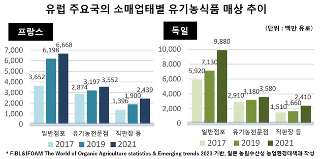일본은 물론 전 세계적인 유기농 시장은 지속적으로 확대되고 있으며, 정부 차원에서 이를 지원하는 국가도 있다. 유기농업연구소(FiBL)와 세계유기농업운동연맹(IFOAM)의 2023년 세계 유기농업 통계 조사에 따르면, 유기농업을 활발히 추진하고 있는 프랑스에서는 2017년에서 2021년까지 4년간 유기농식품 매출이 59.8% 증가했으며, 독일의 경우 동 기간 매출이 53.5% 증가하며 빠른 상승세를 보이고 있다.
